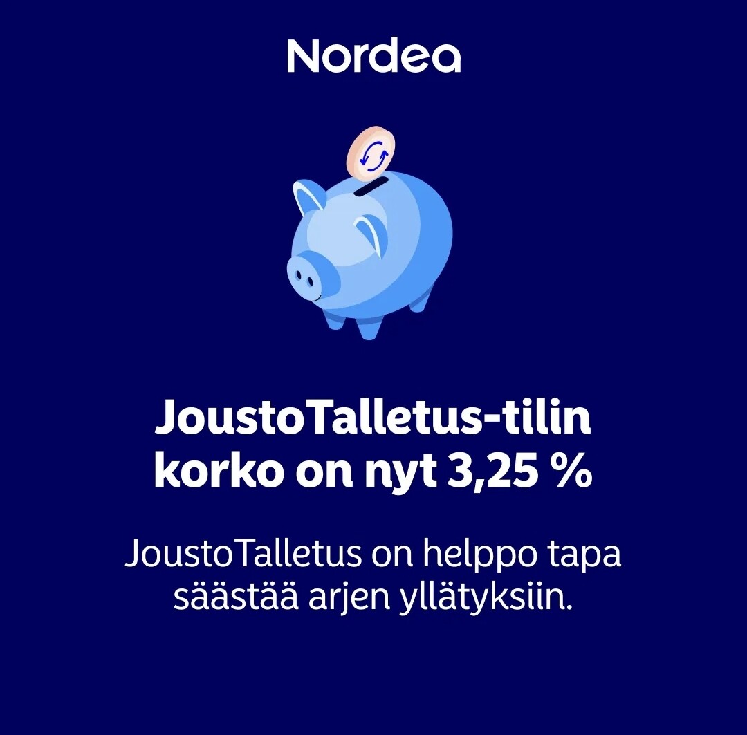 Nordea on nostanut tarjoamansa JoustoTalletus-tilin koron marraskuun alusta 3,25 prosenttiin.