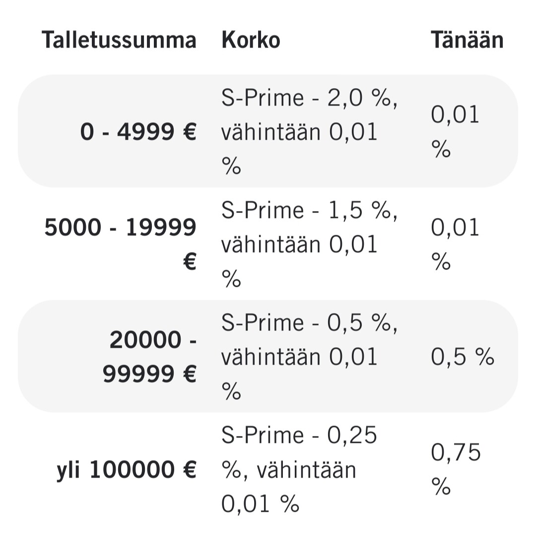 Päivitys: S-prime nousee 10.1.2023 1,5%:iin, eli minimissään 100 000€:n talletukselle saa 1,25% korkoa. Ja noussee taas pian, ellei korot vallan laskuun lähde. https://www.s-pankki.fi/fi/tiedotteet/2022/s-pankin-prime-korko-nousee-10.1.2023/