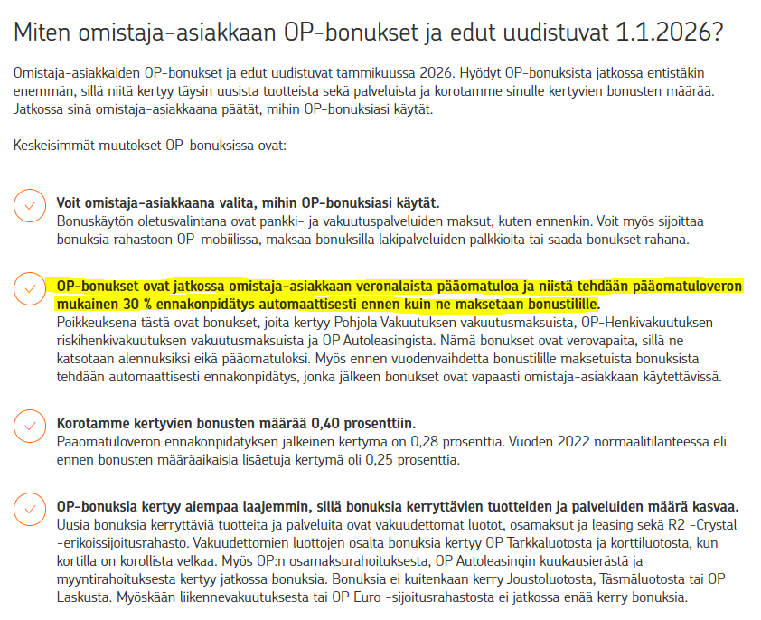 Tämä on ehkä vähän off-topic, mutta selkeästi parhaan tuoton lyhyellä aikavälillä saa käyttämällä kaikki jo olemassa olevat OP-bonukset tänä vuonna, koska ensi vuonna niiden ostovoima putoaa 30%. Tämä johtuu siitä, että kaikista vuoden vaihteen yli säilyvistä bonuksista pidätetään tuo 30% heti vuoden vaihtuessa. Sen jälkeen sen jäljelle jääneen 70% voi toki nostaa vaikka käteiseksi tai säästää ja käyttää kuten tähänkin asti (ja vanhimmat bonukset haihtuvat itsekseen). Vielä tänä vuonna niiden ostovoima on kuitenkin 100%, jos vaan löytyy jokin järkevä käyttökohde, esim. vakuutus tai vaikkapa lakipalvelut.
