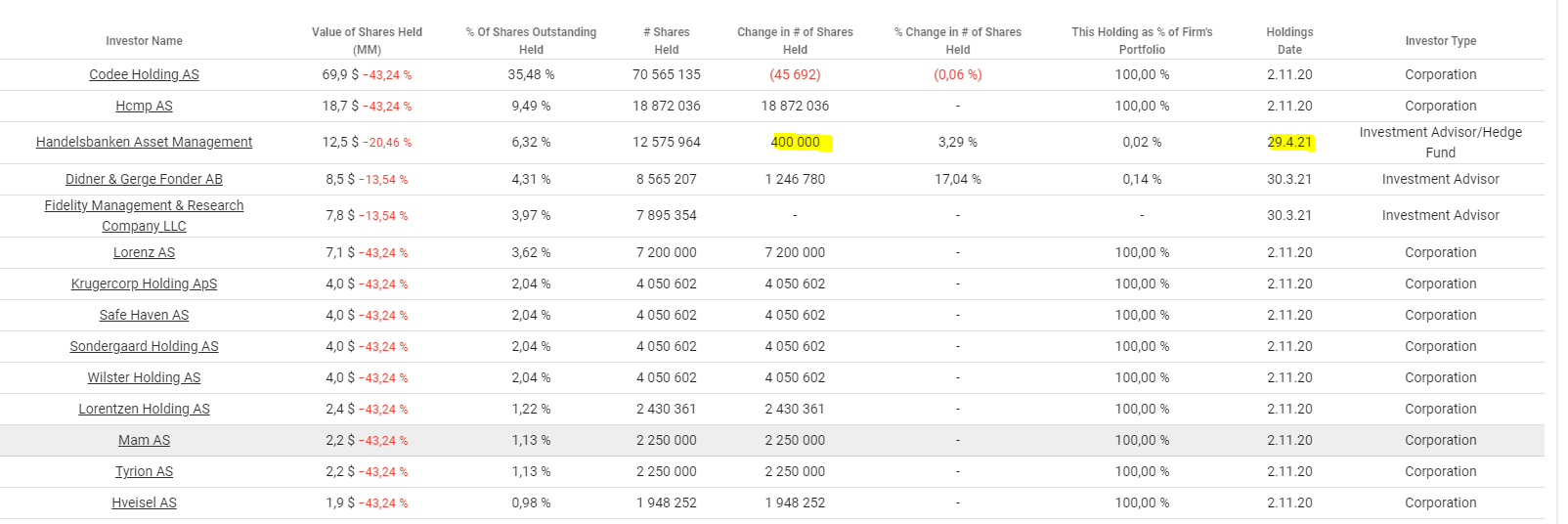 Didner & Gerge Fonder lisäillyt noin 1,2 milj lappua. Muuten tilanne ennallaan kärkipäässä. SEB oli nippa-nappa TOP20 listalla 200t lappunsa kanssa ja oli myynyt ne pois.