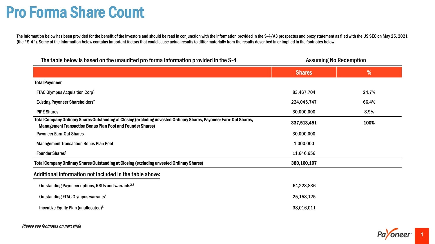 As a result of the completion of this business combination, a new public entity under the name Payoneer Global Inc. (“the Company”), and its common stock and warrants, will begin trading today on the Nasdaq stock market under the ticker symbol “PAYO” and “PAYOW”, respectively.