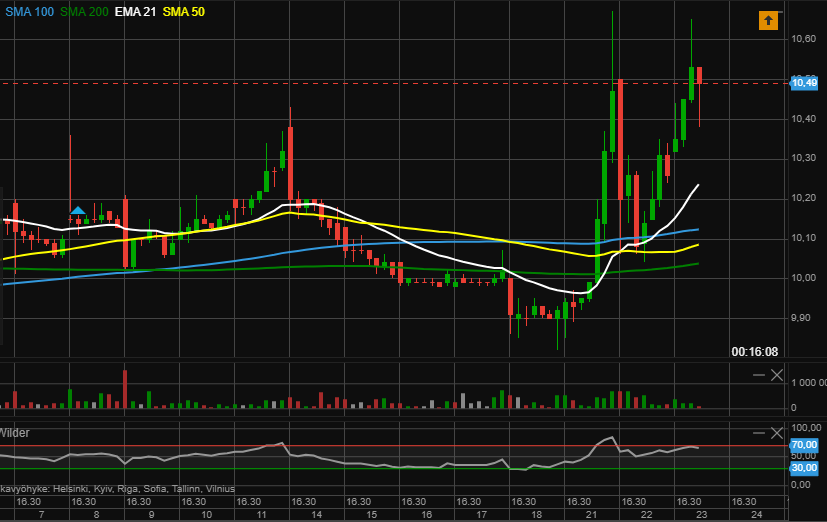 Teknisesti hieman ikävän näköiset piikit ylöspäin parin päivän sisään. Ostajia löytynyt, mutta myyty alas samantien. Periaatteessa voi lähteä hyvään nousuun, jos tuosta 10,65-10,67$ tasoista pääsee yli.