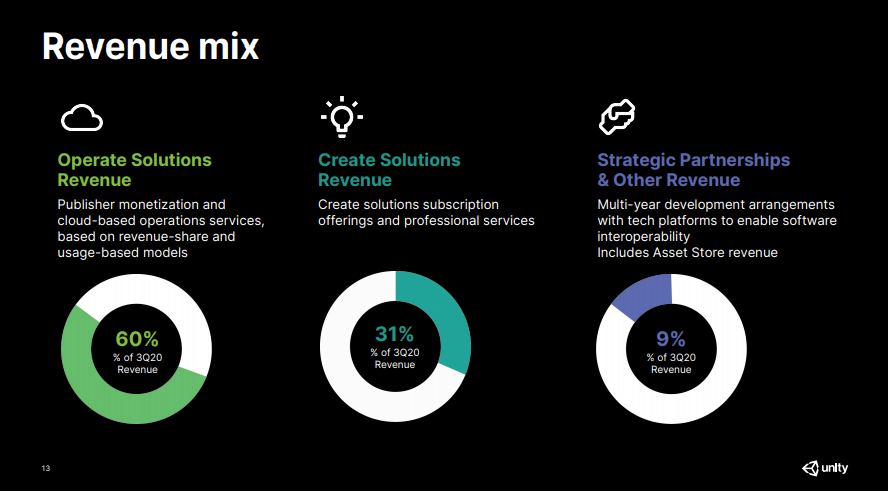 Poimintana voisi ottaa tuon liikevaihdon jakauman. Unityssa erityisesti tuo “Operate Solutions” kiinnostaa, sillä tuolla Unityn hinnoittelumallit ovat X % liikevaihdosta tai käytön mukaan, mikä mahdollistaa kovan skaalautuvuuden.