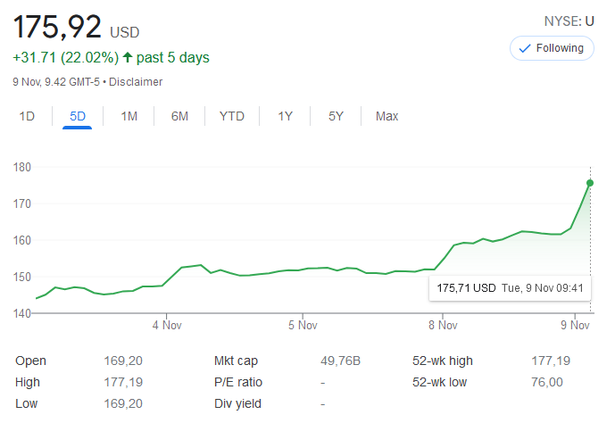 Unityn Q3 tulokset julkaistaan huomenna. Kurssista päätellen alkaa tunnelmat lämpenemään, odotukset on kovat. Ehkä robloxin eilen julkaiseman eninomaisten Q3 lukujen seurauksena tänään noustaan reippaammin. Itse odottelen aika vakaata ohjeistuksen mukaista suorittamista, mutta tämä kurssi näyttää kyllä lähteneen omille teilleen… kertoimissa alkaa olemaan aika paljon sulattelemista ![]()