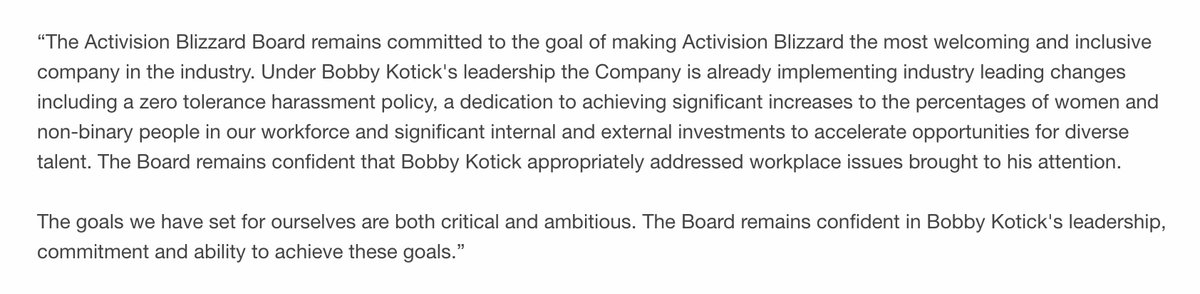 Aika paljon bisnesarvoa kiinni tuossa nimessä ja IP:issä. En jaksa uskoa tuohon strategiaan. Sen sijaan pyritään tarpomaan myrskyn läpi ja “parantamaan tavat” jottei menetetä arvokkaita IPitä. Se on sitten kysymysmerkki että selviääkö Bobby Kotick kyydissä tuon matkan läpi - omistaa vain ~0,5% osakekannasta joten täysin osakkeenomistajien armoilla.