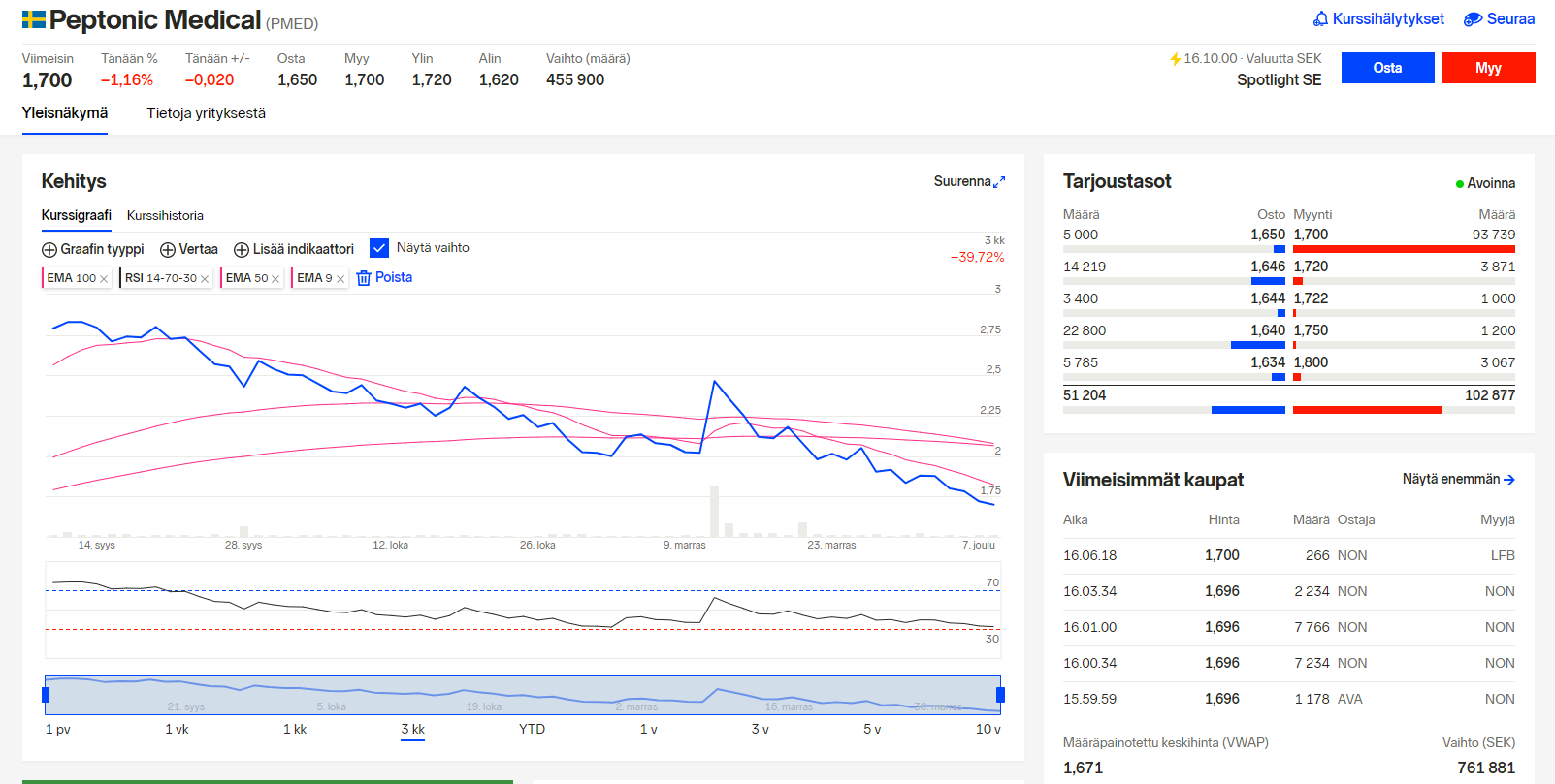 Kaupankäyntihistoriasta näkee, että muutamien tuhansien osakkeiden potteja siellä laitetaan halvalla laitaan. En usko läheskään kaikkien myyntien johtuvan yhtiöstä, vaan ennemminkin kurssin epäsuotuisasta kehityksestä. Katsotaan, jos saisi hieman vielä kasvatettua positiota.