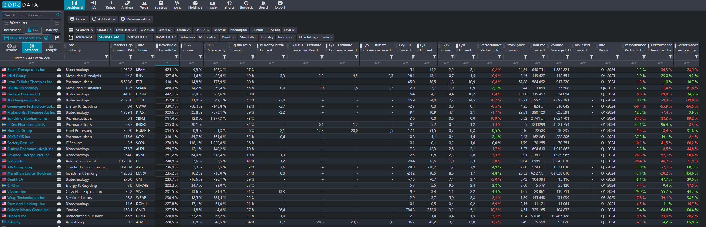 Unfortunately, the free version is quite limited in terms of stock universe.