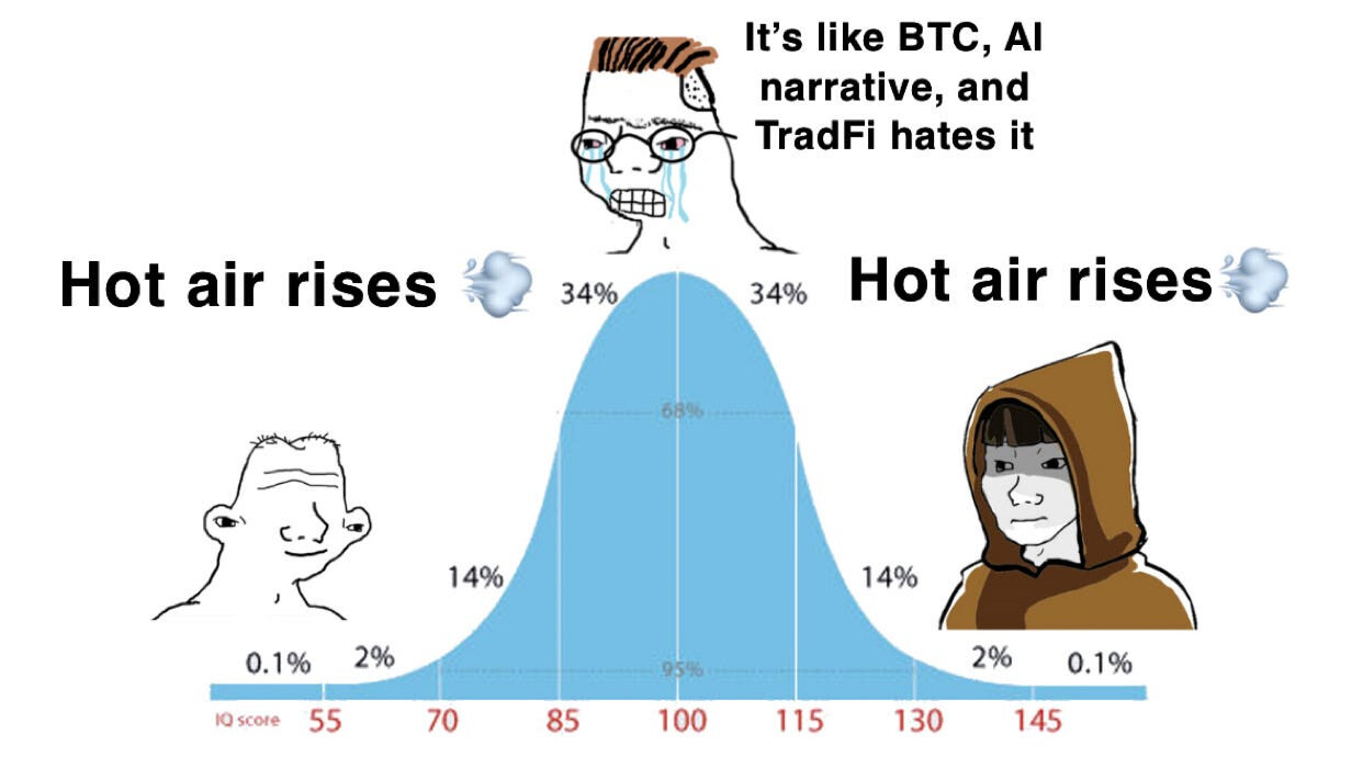 FARTCOIN:in yhteydessä viljelty Hot Air Rises -slogan on itseironinen ja samalla kuvaa täydellisesti kryptokuplaa ja ehkä myös laajempaa markkinatilannetta. Typerä lapsellinen huumori tässä kontekstissa yksinkertaisesti toimii, sillä en ole vielä nähnyt kenenkään kykenevän mainitsemaan FARTCOIN-kryptovaluuttaa vakavalla naamalla. FARTCOIN luontikertomus Truth Terminal AI:n takahuoneissa hallusinoimasta “täydellisestä” meemikolikosta osuu lisäksi kuumimpiin sijoitusnarratiiveihin.