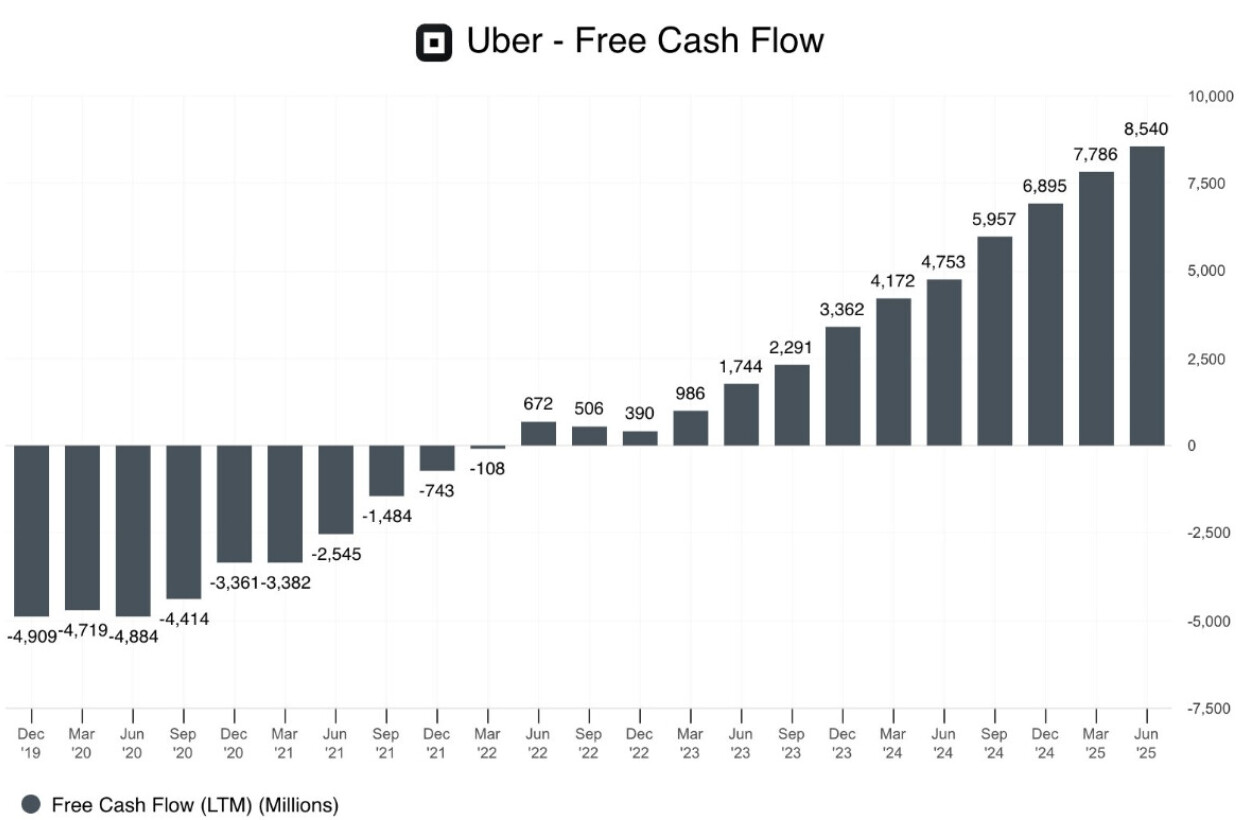 Uberâs main competitors in ride-hailing include Lyft and Bolt, and in food delivery, Doordash. Uber is the only one of these that is profitable. In addition to network effects, profitability gives Uber a competitive advantage going forward; more can be invested in product development than others, and if necessary, prices can be competed with more aggressively than others. Iâm not claiming that Uber will permanently destroy these competitors, but a competitive advantage exists. Here is Uberâs free cash flow development; it turned profitable already in 2022, and since then, the curve points northeast: