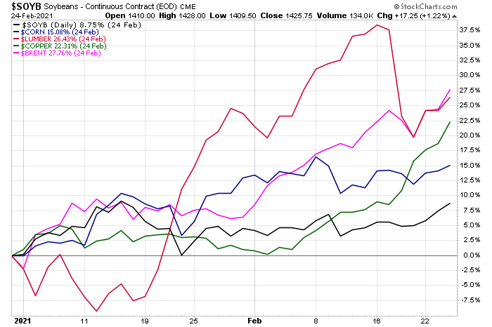 Tässä on hieman esimerkkejä YTD-hinnanmuutoksista raaka-aineissa. Spekuloin vähän tuosta raaka-aineiden uudelleenarvostuksesta suhteessa osakkeisiin. Esim. kupari on pian all time high -lukemissa. Maataloustuotteidenkin hinnat ovat nopeassa kasvussa futuurimarkkinoilla, joten ehkä se voisi alkaa myös näkyä alan kannattavuudessa?