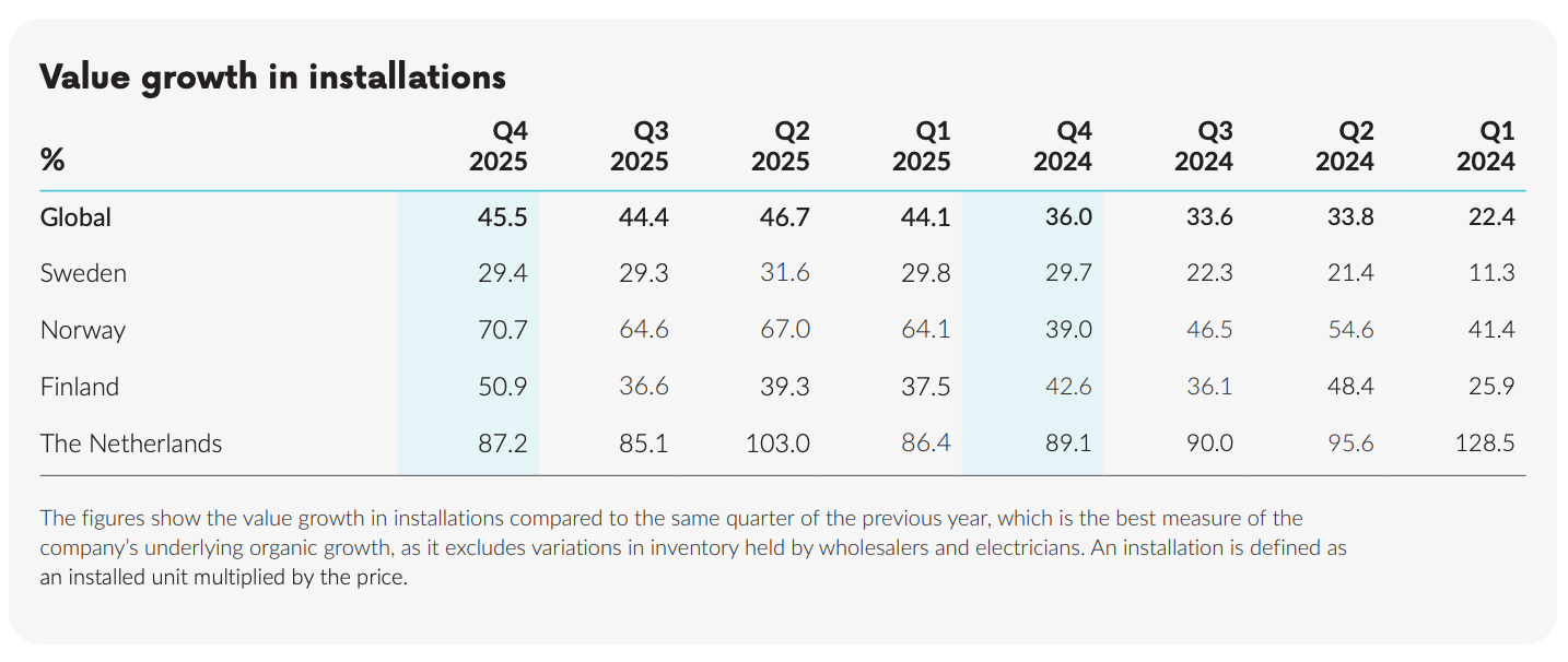 Value growth in installations -metriikan mukaan voimakkainta kasvua Q4:lla Hollannissa ja Norjassa, mutta myös Suomessa kasvu kiihtyi.
