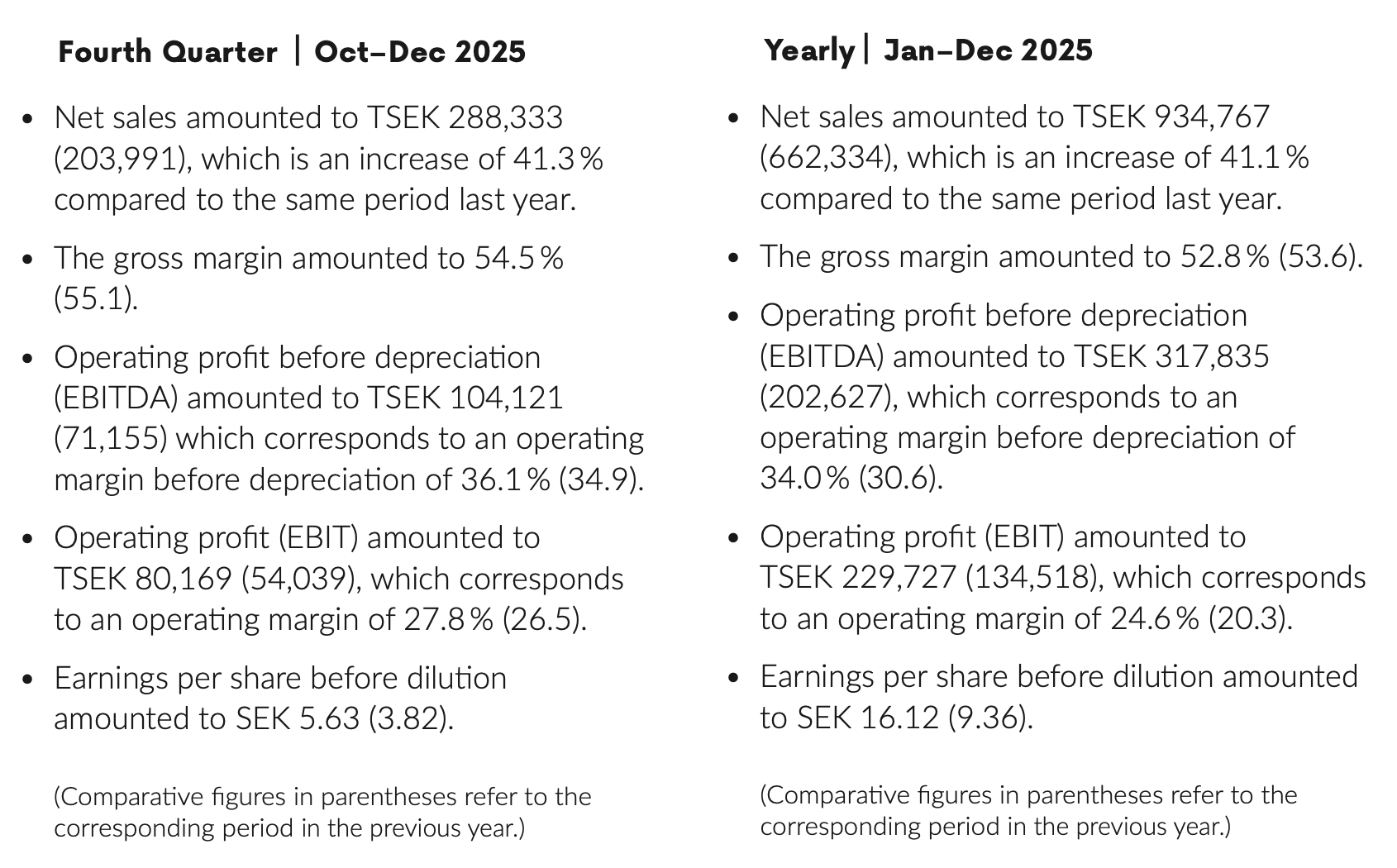 - Voimakas tuloskasvu jatkui ja myös kannattavuus parani. Koko vuoden EBIT kasvoi 71%, vuoden operating margin 24,6 % (2024: 20,3%), EPS kasvoi 72%.