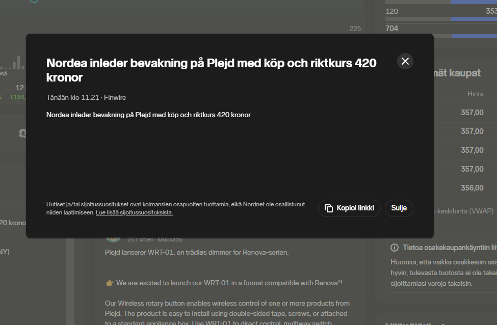Nordea aloittaa Plejdin seurannan ostosuosituksella ja 420 kruunun tavoitehinnalla