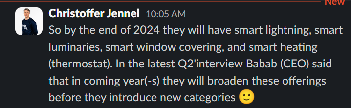 • Norjan kiinnostusta termostaattiin on puheltu pitkään ja Norjassa ilmeisesti suuri osa taloista on sähkölämmityksellä. Mielenkiintoista nähdä Q4 raportissa kommentit tästä jatkuen ensi vuoteenkin. Yhdistettunä ensimmäiseen pointtiin Q4/24 tulee Norja-jytky?