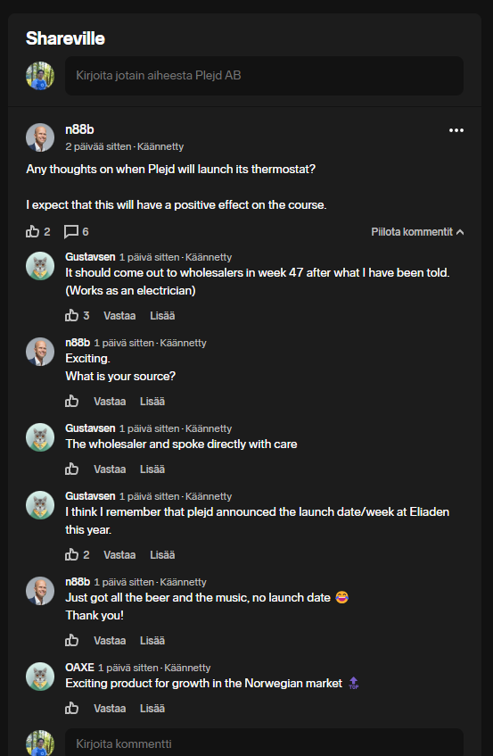 Onpas kiva että Plejdistä on herännyt keskustelua. Pitänyt useamman kerran itsekin avata keskustelua mutta en ole saanut aikaiseksi. Olen ollut vuodesta 2017 osakkeenomistaja ja järjestelmän käyttäjä vuoden verran.