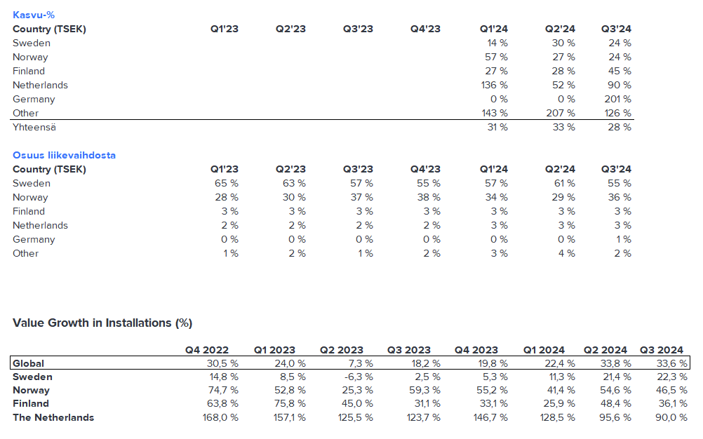 Keräsin tässä pikaisesti kasvudatat ja eri markkinoiden osuudet viime ajoilta. Mielenkiintoinen datapiste tuo asennusten arvon muutos, jonka yhtiö toi mukaan tähän raporttiin. Varmasti paras orgaanisen kehityksen mittari niin kuin firma itsekin sanoi.