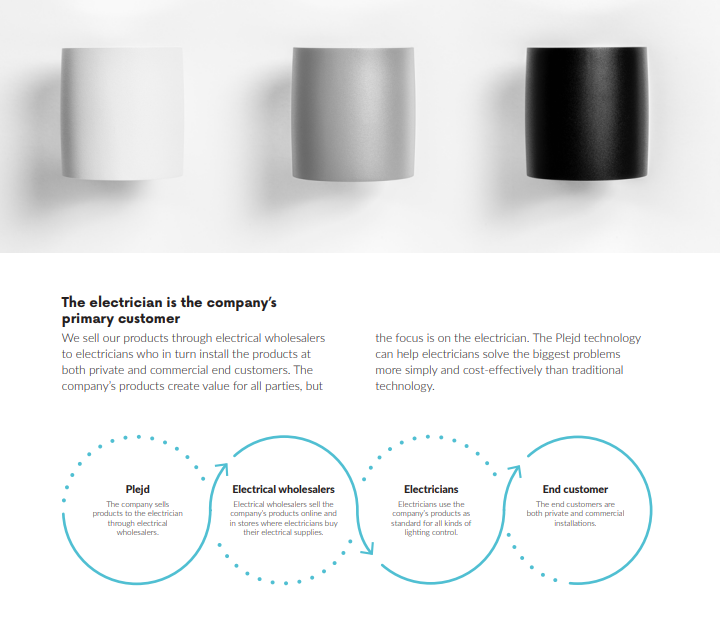 Sijoituscasena näen Plejdin helppouden/luotettavuuden etuna. Valtaosa ihmisistä on kuitenkin asioissa täysin kujalla ja ottavat sen mitä asentaja heille suosittelee. Valikoima laajenee jatkuvasti mikä edesauttaa kasvua Ruotsissa, Norja vaikuttaa seuraavan Ruotsin jalanjäljissä ja Suomi tulee perässä. Uusia tuotteita tulee säännöllisesti ja erityisesi lattialämmitystermostaatti luo suuntaa Plejdille että halua on laajentua valaistuksesta isomminkin kotiautomaatioon.
