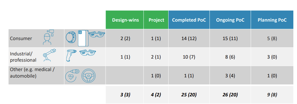 ”Design win” on yritykselle tärkeä etappi, jolloin proof of concept -demo realisoituu tuotteen ja Tlens-tilauksiksi. TLens on parhaillaan käytössä kahdessa lasten älykellossa (Kiinan markkinat, etukamerana ja kuvauskamerana) ja ensimmäinen linssiä käyttävä teollinen tuote on käsiskanneri, joka tulee OEM-valmistajalta markkinoille syksyn aikana.