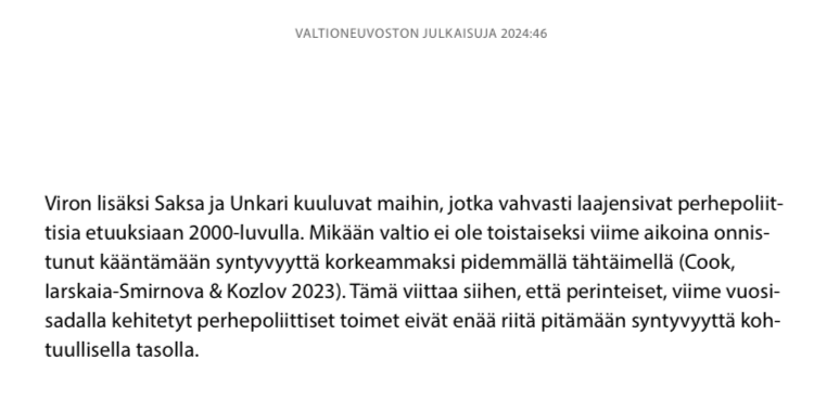 Kuten selvityksessä todetaan, niin yksikään maa ei ole onnistunut kääntämään syntyvyyttä perinteisin keinoin. Rahaa pitäisi tarjota niin paljon siihen että jokainen nainen tekisi 2-3 lasta, ettei millään yhteiskunnalla ole siihen varaa. Kuten lähes aina käy näissä selvityksissä, niin myös tässäkin paperissa lähinnä ehdotettiin tulonsiirtojen lisäämistä yhdelle väestöryhmälle syntyvyyden parantamisen varjolla, ilman että haettiin aitoja ratkaisuja ongelmaan.