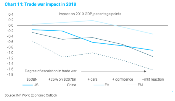 Hyvää viikon alkua, foorumilaiset! Kauppaneuvottelut USA:n ja Kiinan välillä jatkuvat tänään, nopeaa läpimurtoa tuskin kuitenkaan odotettavissa. Alla olevassa kuviossa (lähde TS Lombard, IMF) loistavasti havainnollistettu kauppasodan jatkumisen ja laajenemisen vaikutuksia. Ei ihan nappipeliä maailmantaloudelle.