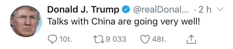 Monet taitaa kuvitella, että talouden hyytyminen johtuu kauppasodasta ja sen laajentumisen pelosta, koska pelkästään puheilla ratkaisusta saadaan aikaan tällasta nostetta. Maailmantalous hyytyy myös ihan muista syistä ja kauppasodalla on tällä hetkellä melko marginaaliset vaikutukset.