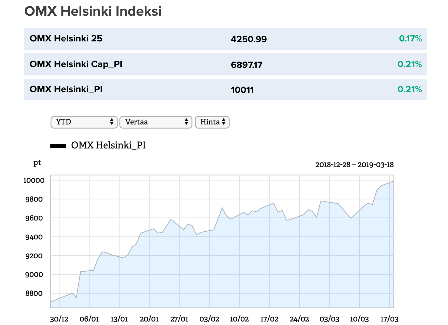 Helsingin pörssin yleisindeksi takaisin yli 10 000 pisteen: nousua vuoden alusta +15 % ja joulukuun pohjista +16,5 %.
