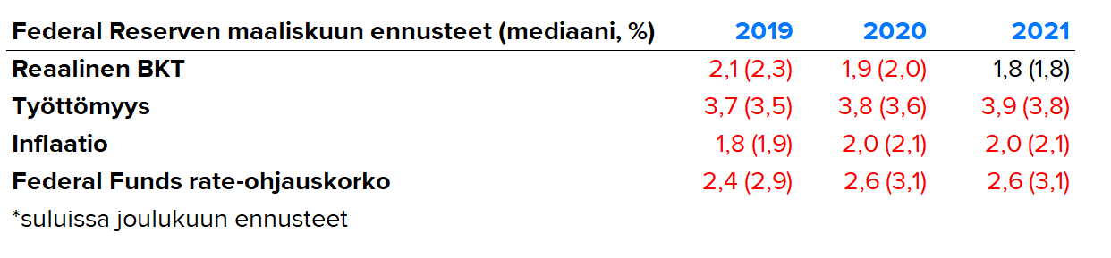 Iltaa kaikille! Taitaa USA:ssa olla koronnostosykli virallisesti ohi, Federal Reserven korkoennusteet laskivat kolmessa kuukaudessa kertaheitolla 0,5 %-yksikköä, eikä tälle vuodelle odoteta enää yhtään koronnostoa. Myös taseen supistamistoimet lopetetaan syksyyn mennessä ja talousennusteita viilattiin alas urakalla tälle ja ensi vuodelle: