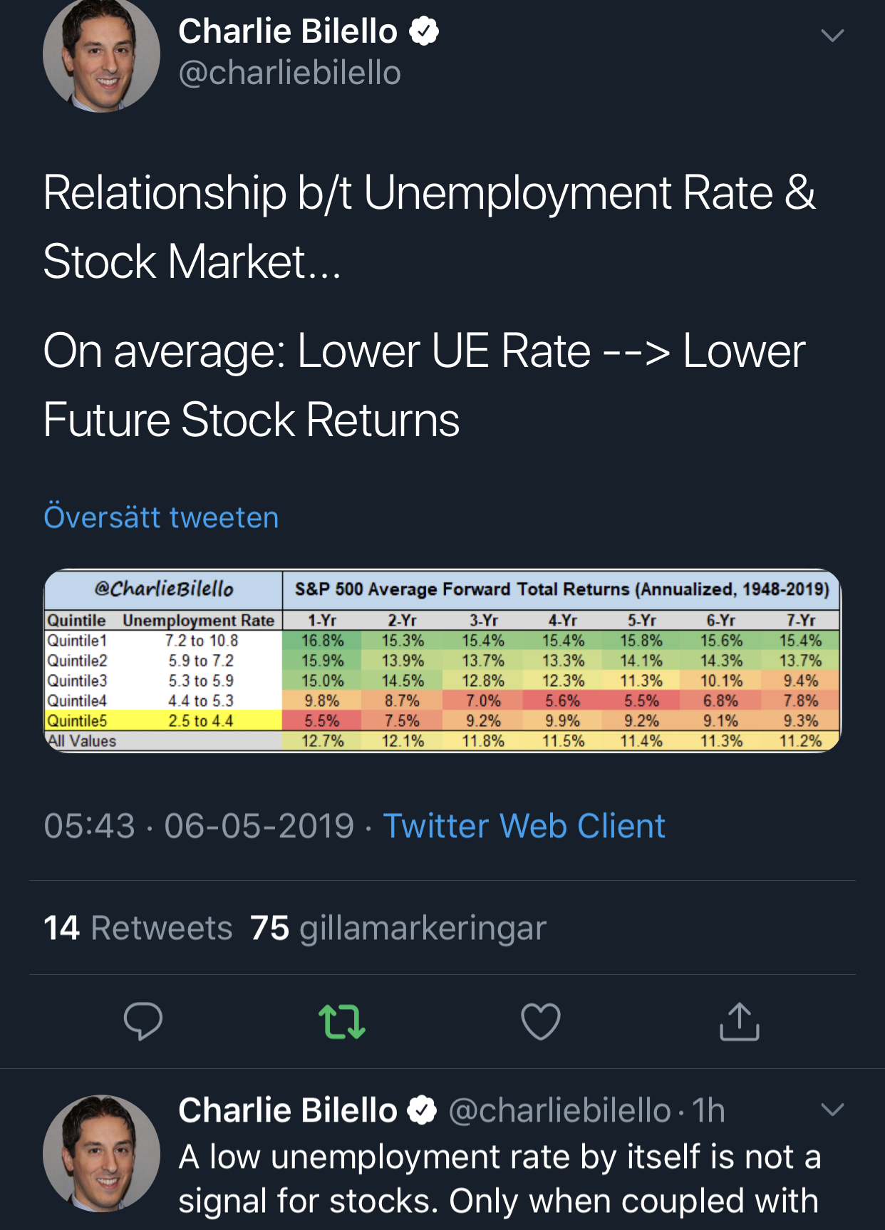 Alempana hän vielä huomauttaa, että alhainen työttömyys ei vielä itsessään tarkoita heikkoja tuottoja mutta jos vielä arvotustasotkin ovat korkeita… (kuten ne nyt monella mittarilla ovat).
