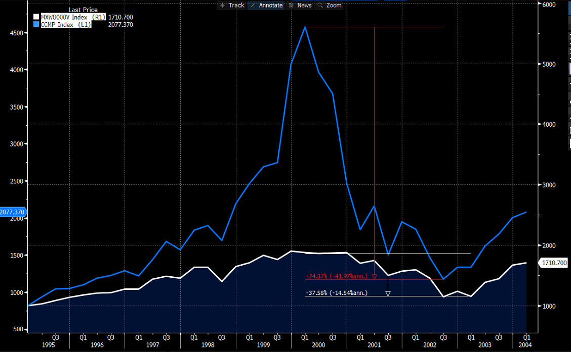 Esim. Berkshire Hathway käytännössä kontrasi Nasdaqia. Se puolittui kuin Nasdaq nousi, mutta näki myös pohjansa tismalleen samaan aikaan kun Nasdaq aloitti kolme vuotta kestävän, -80 % kokoisen laskumarkkinansa.