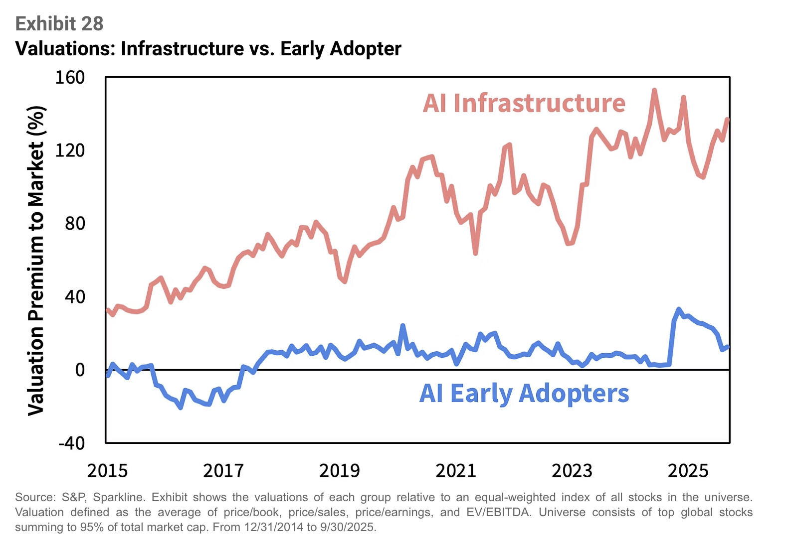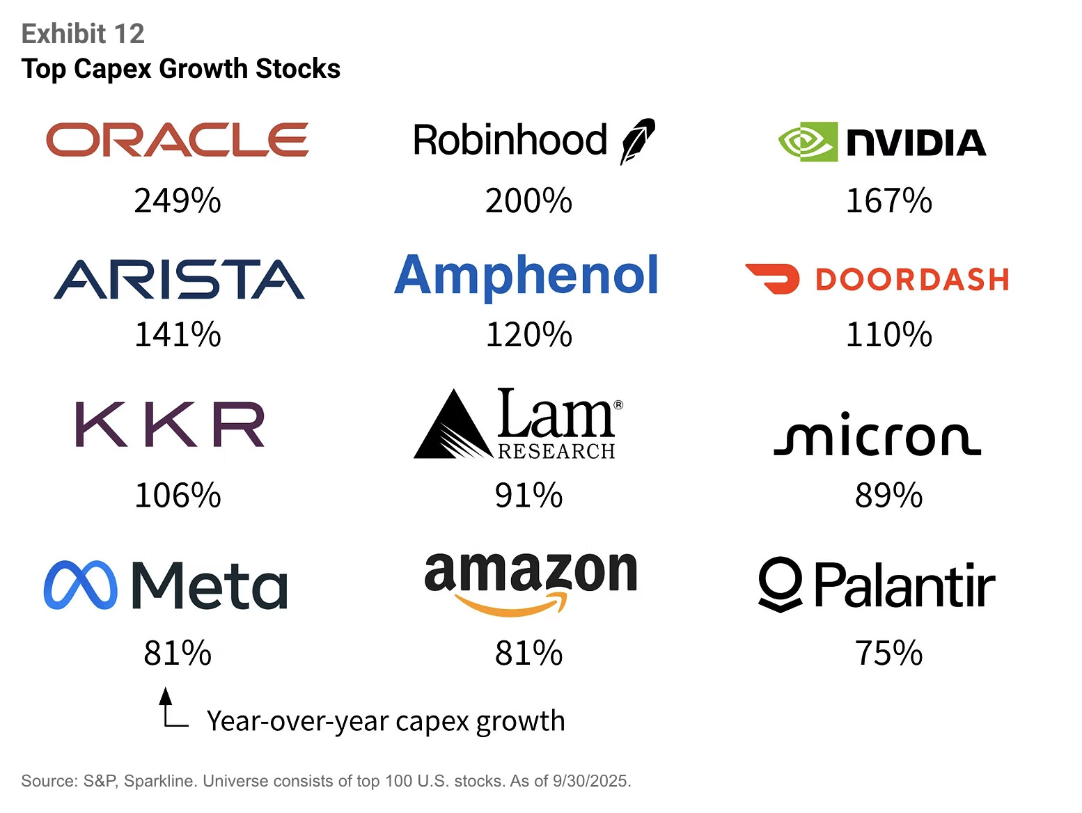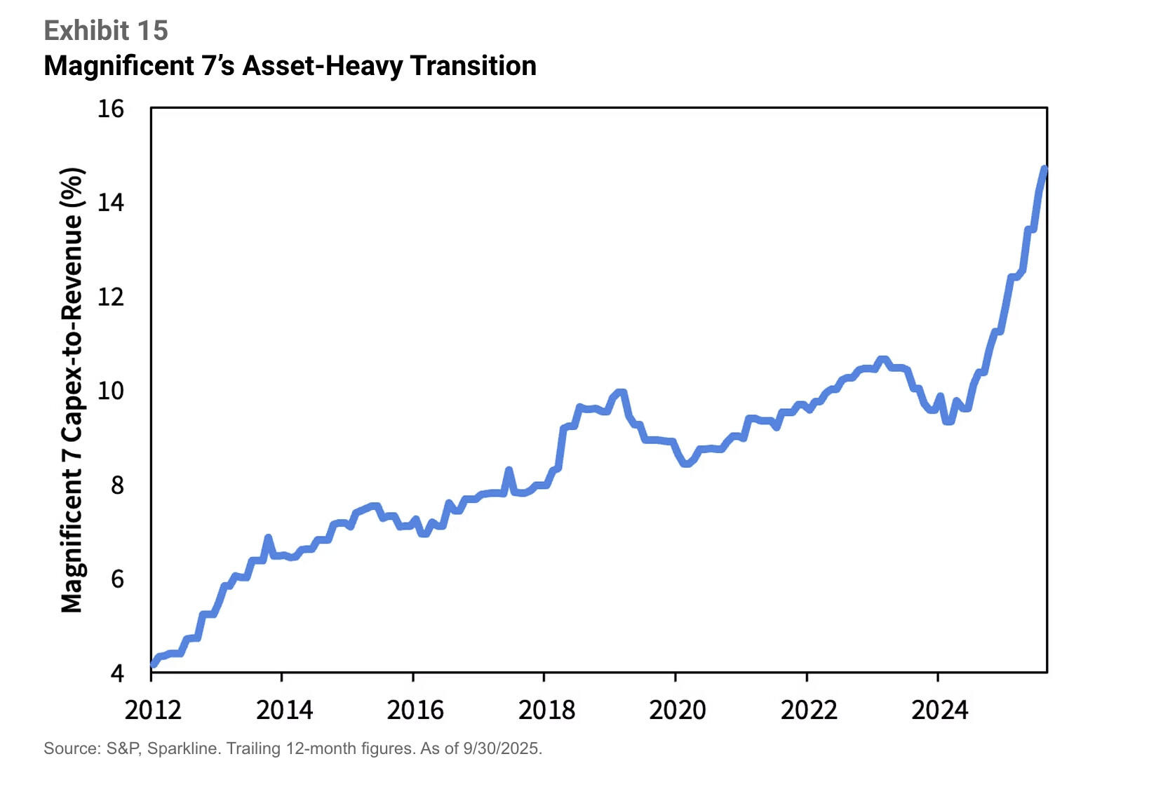 Exhibit 13 (“Magnificent Dominance”) näyttää, kuinka ne ovat jättäneet muun S&P 500:n kauas taakseen. Niiden menestyksen taustalla on ollut “asset-light”-malli – liiketoiminta, joka perustuu aineettomiin varoihin kuten ohjelmistoihin, brändeihin ja verkostovaikutuksiin.