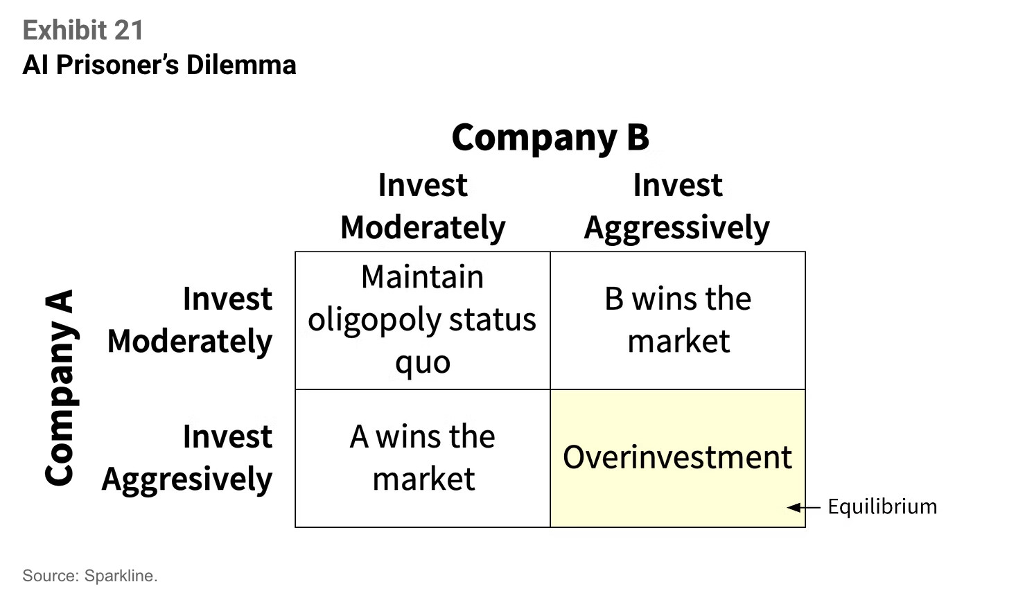 Artikkelin lopussa Wu kuvaa tekoälykilpailua klassisen peliteorian näkökulmasta. Vaikka yritysten olisi rationaalista hillitä investointejaan ja säilyttää nykyinen oligopoliasemansa, kukaan ei uskalla jäädä jälkeen. Jokainen pelkää, että kilpailija voittaa “kaikki markkinat” tekoälyn avulla. Tämä johtaa “vankien dilemmaan”, jossa kaikki investoivat liikaa – vaikka se tuhoaisi kollektiivisen kannattavuuden.