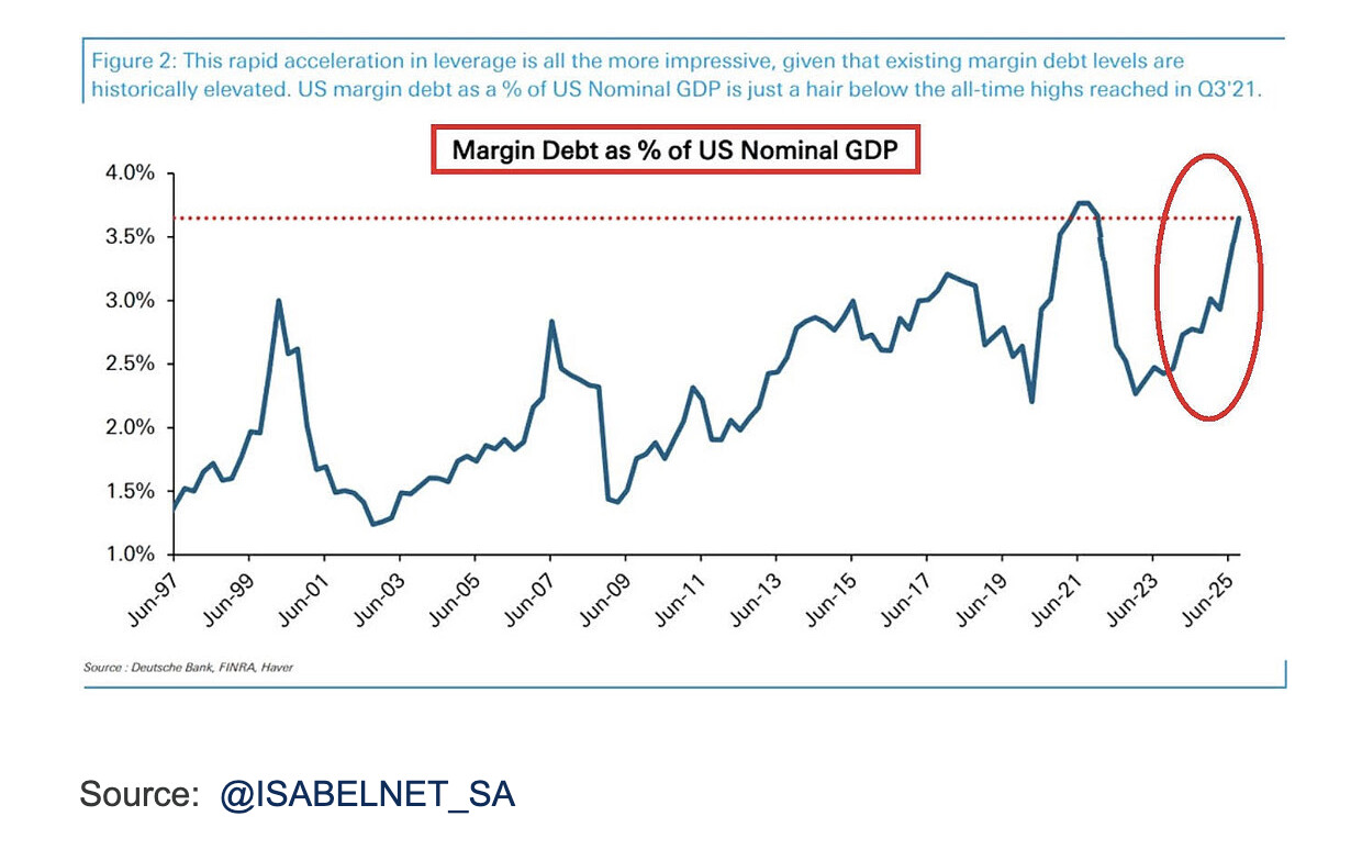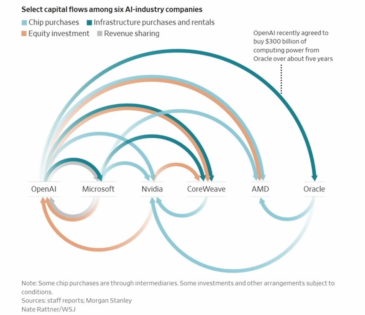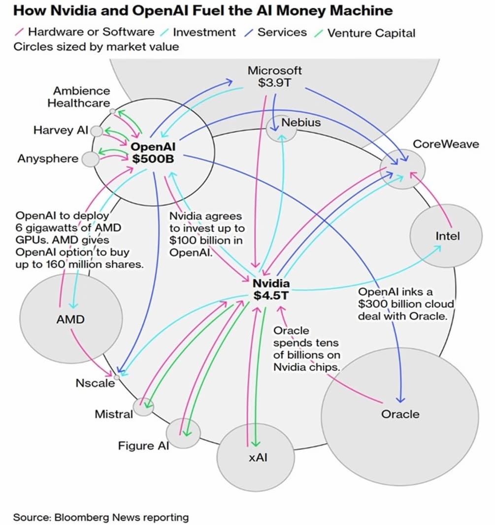 Exhibit 19 (“Magnificent 7 Free Cash Flow”) osoittaa, että vapaa kassavirta on jo alkanut laskea tekoälyinvestointien vuoksi. Lisäksi syntyy “circular financing” -ilmiöitä, joissa yritykset rahoittavat toisiaan keinotekoisesti: esimerkiksi Nvidia sijoittaa OpenAI:hin, joka puolestaan ostaa Nvidian siruja.