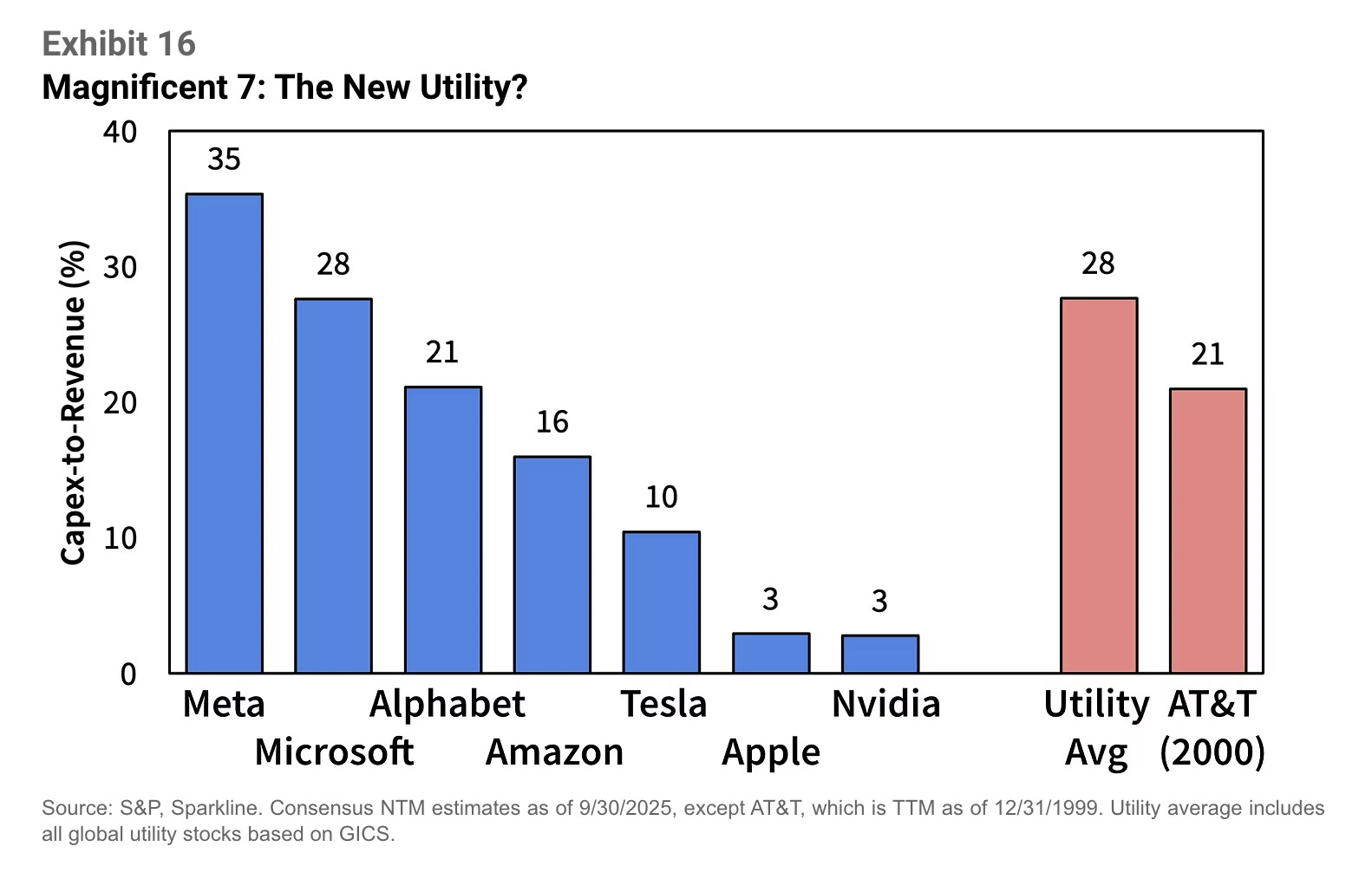 Nyt tilanne on kuitenkin muuttumassa. Exhibit 15 (“Magnificent 7’s Asset-Heavy Transition”) osoittaa, että niiden pääomaintensiteetti on noussut 4 %:sta 15 %:iin liikevaihdosta vuodesta 2012 lähtien. Meta, Microsoft ja Alphabet käyttävät jo 21–35 % liikevaihdostaan investointeihin – enemmän kuin keskimääräinen globaali energiayhtiö tai jopa AT&T telekuplan huipulla.