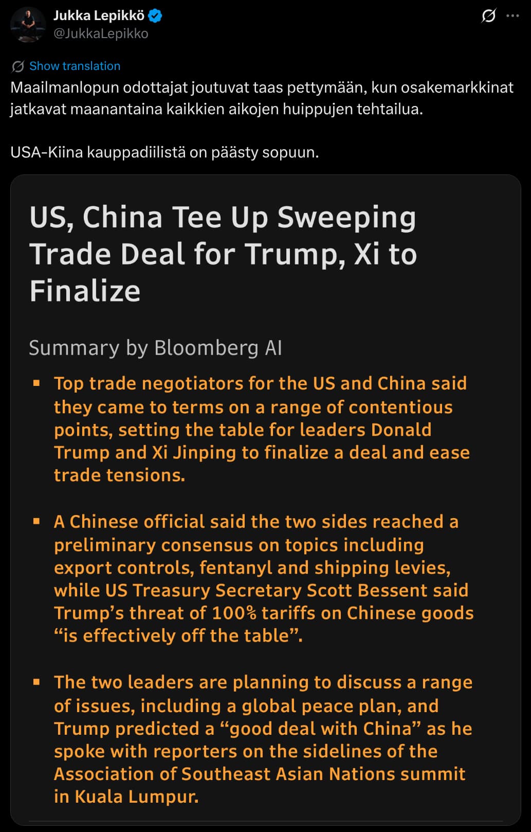 Wu huomauttaa, että tekoälyinvestoinnit ovat tällä hetkellä niin suuria, että ne käytännössä tukevat Yhdysvaltain talouskasvua. Arvioiden mukaan tekoälyyn liittyvä pääomankäyttö on vastannut jopa puolta maan BKT:n kasvusta kuluneen vuoden aikana. Tämä tekee taloudesta ja sijoittajista entistä riippuvaisempia tekoälyhankkeiden onnistumisesta.