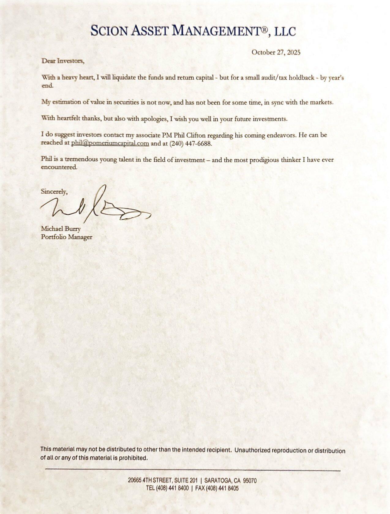 Historiallinen hetki, ja kuvaavaa markkinasta. Vaikka, tuskin Burry kokonaan lopettaa eiköhän hän jatka esim. ns. “family officen” merkeissä sijoittamista.