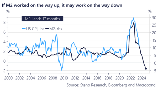 Rahanvarannon (M2) supistuminen antaa varoitussignaalin deflaation ja taantuman mahdollisuudesta ![] Siinä missä poikkeuksellinen nousu oli varoitussignaali inflaatio-ongelmasta, nyt riskit ovat selvästi toiseen suuntaan. Keskuspankkien tulisi laskea korkoja ennakoivasti neutraalille tasolle. Tarve rahapolitiikan kiristykselle on loppunut jo kuukausia sitten.