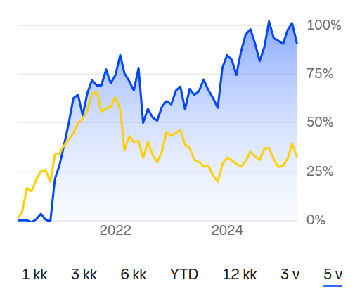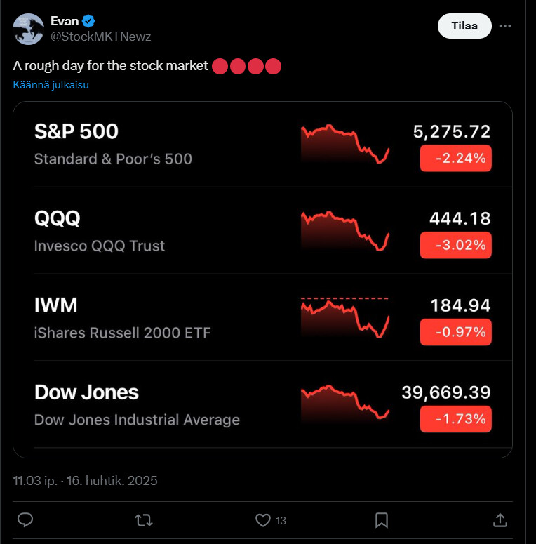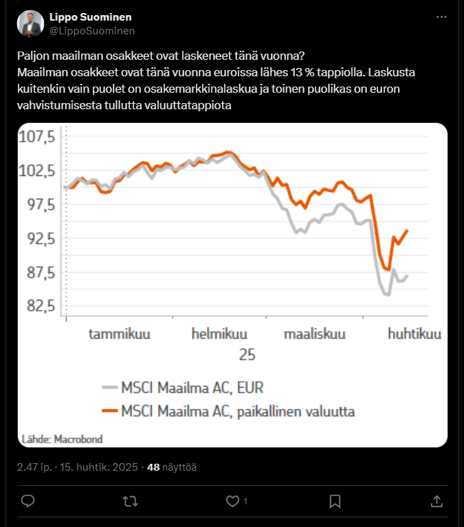 Because the USA has 2 of the world’s largest stock exchanges (NYSE and NASDAQ) and the dollar is a reserve currency. Finland is a tiny little peripheral market that, to top it all off, has a pleasant eastern neighbor. So why wouldn’t Finland fall more? The waves from the bigger boys’ antics will surely hit here one way or another. Finland’s muscles certainly won’t fill any trade relationship void. Even on a European scale, it’s unlikely to succeed in the big picture when everything happens slowly without unified decision-making. Even when it comes to supporting Ukraine, we seem to have more or less returned to mundane activities after the initial barking and finger-pointing.