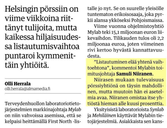 Yhtiö on selvittänyt mahdollisuutta hakea yhtiön osakkeet kaupankäynnin kohteeksi First North -