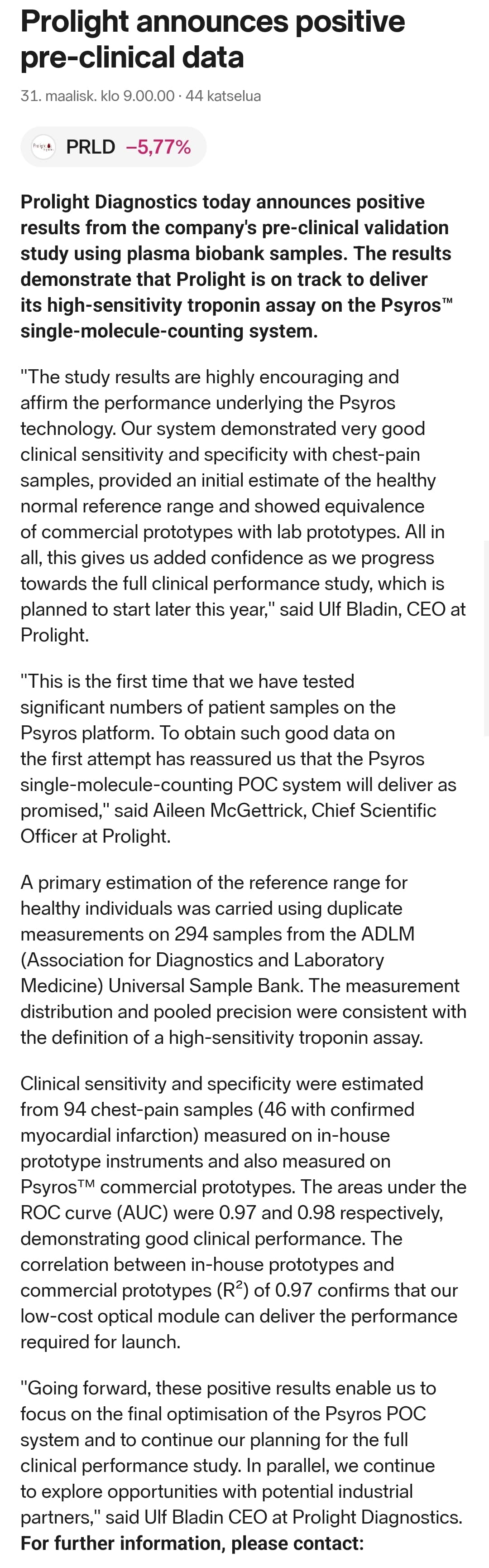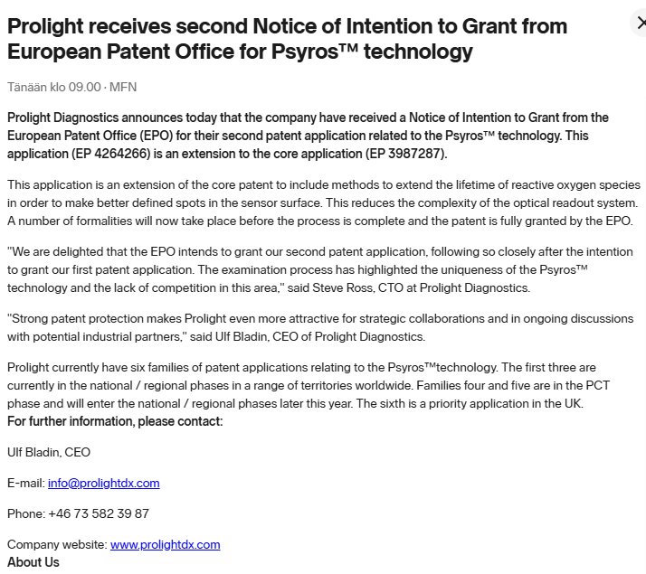 Prolight Diagnostics är ett bioteknikföretag grundat 1999, som noterades 2017. Aktien finns för närvarande på First North Sweden-marknaden. Företaget utvecklar små, ljusbaserade POC-diagnostiksystem som kan mäta nästan vilka molekyler som helst i blodet, även vid mycket låga koncentrationer, med en bärbar och prisvärd enhet. Enligt företagets egna påståenden ger tekniken en mätnoggrannhet och ett mätområde i nivå med centrallaboratorier i ett litet, bärbart och kostnadseffektivt paket som kan följa med till exempel i en ambulans. Företagets huvudprodukt heter Psyros.