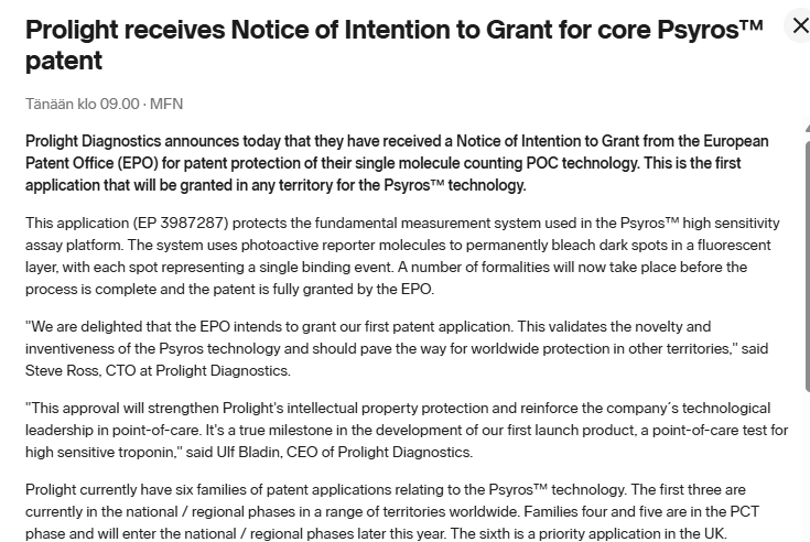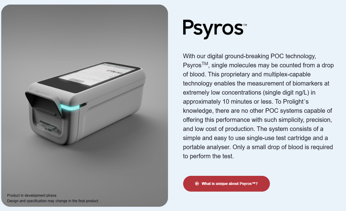 Prolights Psyros-teknologi möjliggör “räkning av enskilda molekyler” från en blodsdroppe. I praktiken kan biomarkörer mätas i mycket låga koncentrationer (x ng/L) på några minuter och enkelt. Tekniken bygger på en engångstestkassett och en bärbar analysator, och den kräver endast en liten blodsdroppe. Till skillnad från många andra POC-system behöver blodplasma inte separeras med centrifug. Enligt Prolight själva finns det ingen annan POC-system som erbjuder motsvarande prestanda, enkelhet, noggrannhet och låga produktionskostnader (Note to self: detta har vi hört förut).