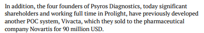 - Företaget har också en annan produkt, Medflex, som utvecklades först. Dess prestanda, särskilt vid låga koncentrationer av biomarkörer, ansågs vara sämre än Psyros, som förvärvades senare. Utvecklingen av Medflex fortsätter dock, utlagd på en tredje part.