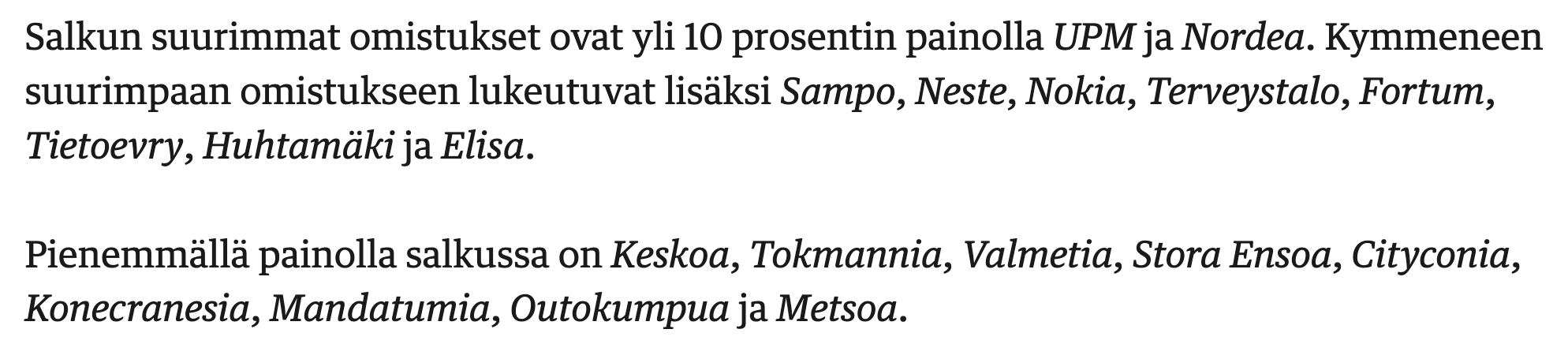 Poiminnat eivät ehkä ole kovin yllättäviä, jos halutaan kerätä likvidi arvo-osakesalkku, mutta ei kai se tarkoita, että näkemystä ei voisi ottaa. Tässä tuntui minusta olevan ihan aito pyrkimys indeksistä poikkeamiseen. Jutusta myös (kannattaa lukea kokonaan, niin saa muutakin kuin osakelistan):