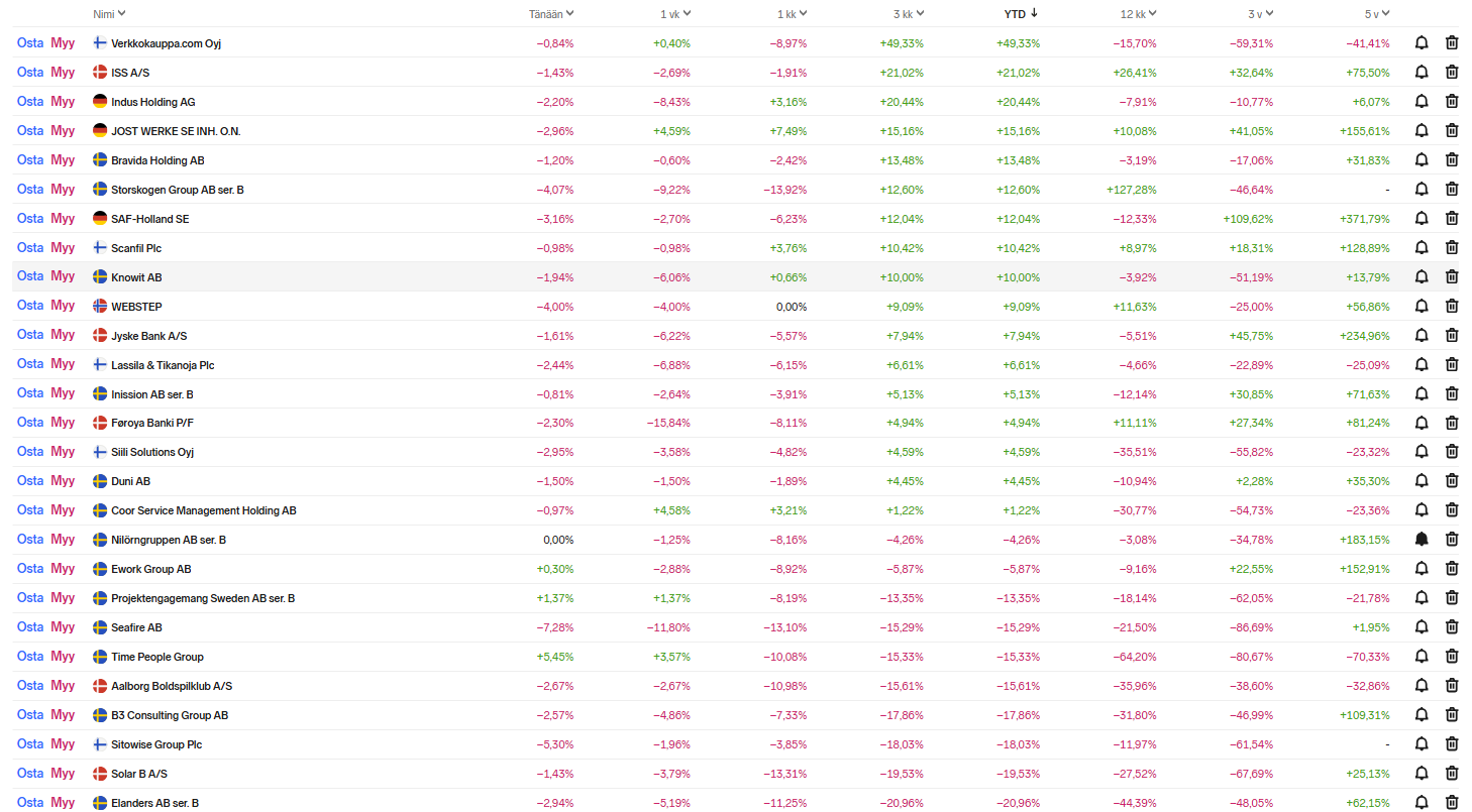 Lisäsin seurantalistaan ne osakkeet, joita Nordnetistä löytyy. Melko muikeasti ovat isoimmat omistukset performoineet YTD eli Q1 sijoitustoiminnantulos pitäisi olla todella vahva myös bondituotot huomioiden.