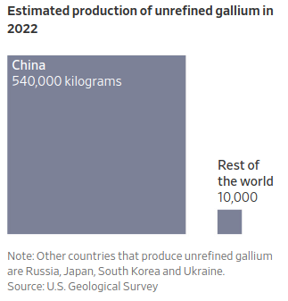 Tällä kertaa kyse on USA-Kiina -väännön seuraavasta luvusta. Kiina vastaa USA:n vientirajoituksiin omalla tavallaan, jotka se katsoo tasavertaisiksi itselleen asetettujen rajoitusten kanssa. Kiinalla on erityisesti galliumin suhteen vipuvartta (kuva WSJ:n artikkelista) →