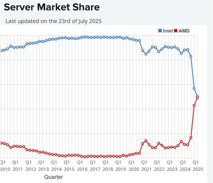 “The graphic seems custom-made, likely drawing from Mercury Research data. However, verified reports show AMD’s overall server CPU market share at 39.4% in Q1 2025, projected to exceed 40% by year-end, not yet 50%. In hyperscale, it surpassed 50% earlier this year.”