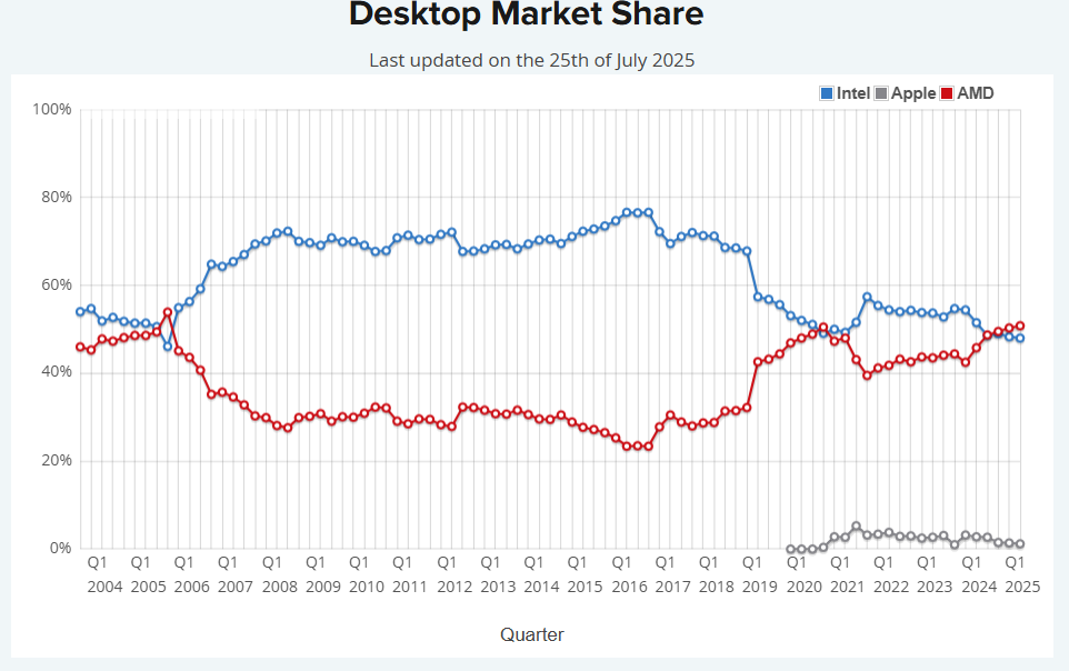 Given the data concerns, the chart’s validity is questionable until PassMark’s updated analysis is released. AMD has indeed been taking market share aggressively, but the extent of the Q3 2025 shift remains unconfirmed."