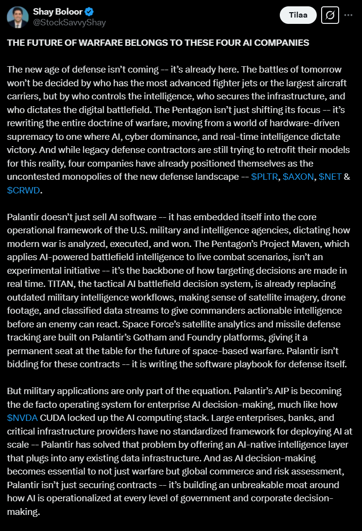 Palantir, Axon, Cloudflare ja CrowdStrike. Palantir hallitsee tiedustelun, Axon oikeudenvalvontateknologian (?), Cloudflare verkon suojauksen ja CrowdStrike kybersodankäynnin. Tviitin mukaan ne eivät vain sopeudu muutokseen, vaan määrittävät sen.