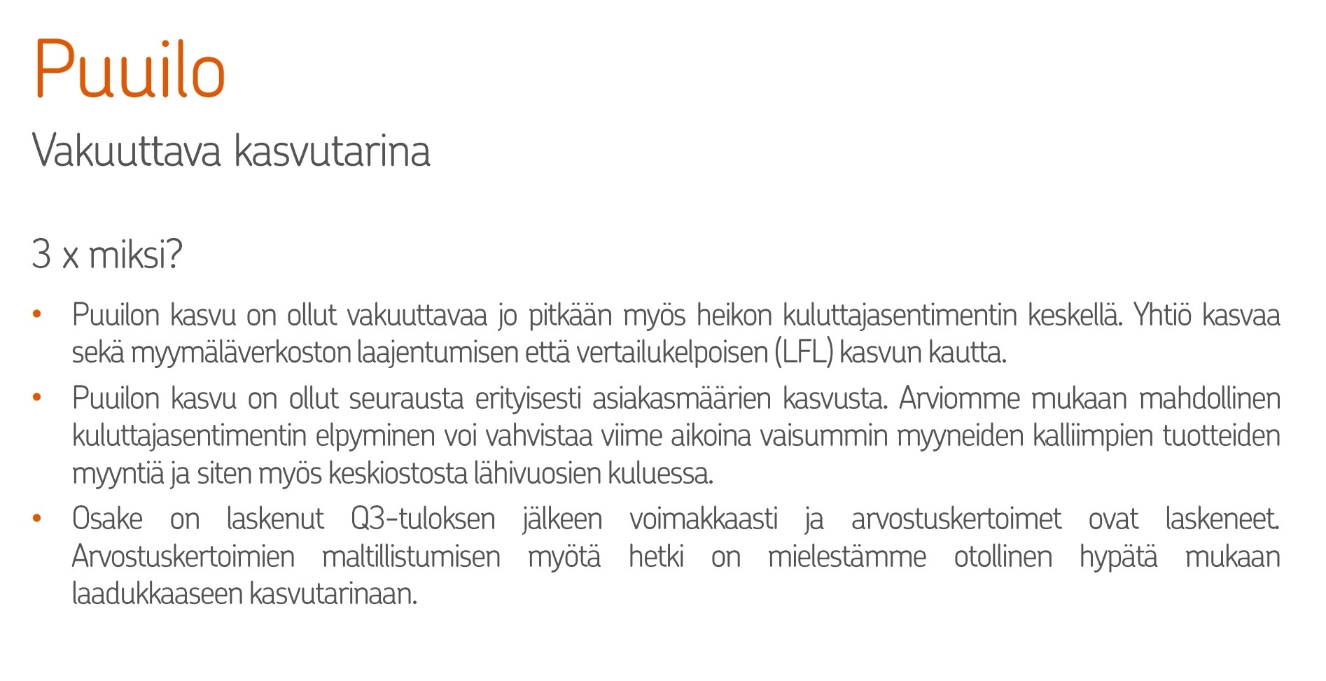 At this stage, when the Finnish market is full of âPuuilo,â I think the question arises as to which is the more meaningful next use of capital: channeling capital into expanding into Sweden, or deciding to buy back shares (or distribute the profits as dividends). From the shareholderâs perspective, the option with the higher expected return is the better solution. In my opinion, increasing revenue adds no value if it is done unprofitably (e.g., Tokmanni). Therefore, expansion is not necessarily a good solution. But, I want to believe at least that Puuilo could expand successfully into Sweden, and I trust that the management will make the right decision; they hopefully have the best insight into the matter.