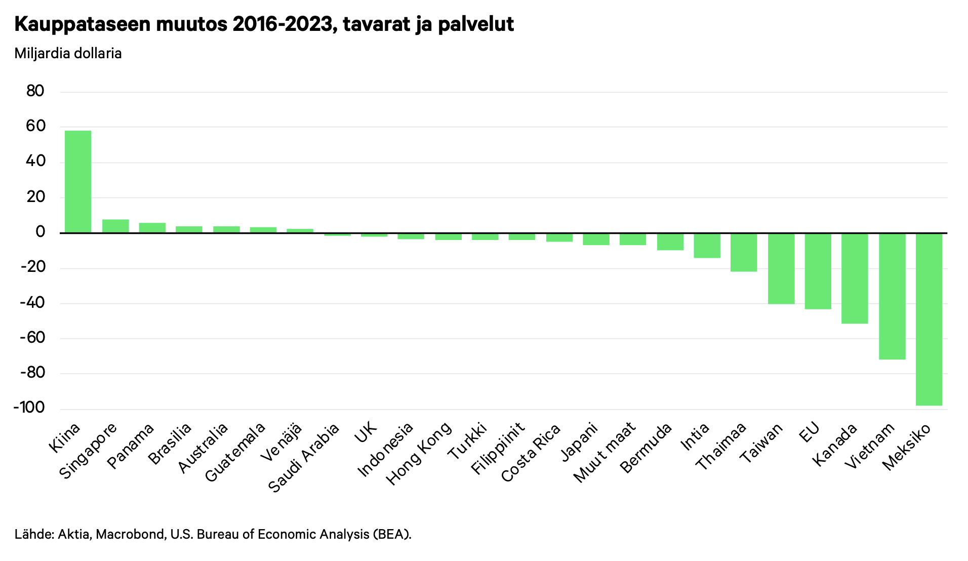 Kun nyt tullit ovat ilmeisen pinnalla, tässä kiinnostava käppyrä USA:n kauppataseen muutoksesta maakohtaisesti. Lähteenä: Aktian markkinakatsaus. Olen aiemminkin tuonut esiin ketjussa, miten Trumpin edellisen kauppasodan aikana, jolloin tariffit kohdistettiin ennen kaikkea Kiinaan ja pidettiin ennallaan myös Bidenin toimesta, Vietnamin vienti kasvoi USA:han selvästi. Muistaakseni TS Lombardilla oli tästä taannoin syvällisempääkin katsausta, jossa todettiin, että osa Kiinan menettämistä tavara- ja palveluvirroista siirtyi Vietnamiin. Kaikkiaan Trumpin edellisen kauden aikana Vietnamin vienti USA:han yli kaksinkertaistui, ellen väärin muista.