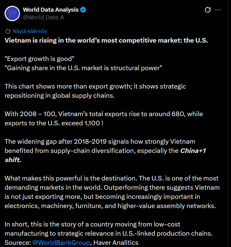 Följande tweet lyfter fram att Vietnam har ökat sin export till USA avsevärt.